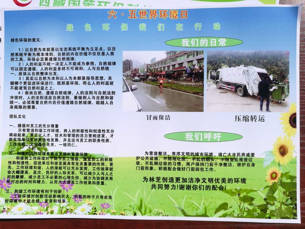 2017年6月5日,在林芝市巴宜區(qū)廈門(mén)廣場(chǎng)開(kāi)展《六五世界環(huán)境日》環(huán)保宣傳活動(dòng),——“青山綠水便是金山銀山”,呼吁廣大市民、游客等廣大群眾參與保護(hù)雪域高原最后的碧水藍(lán)天;此次活動(dòng)由林芝市環(huán)保局牽頭組織舉辦,參與活動(dòng)單位:林芝市市政管理局、西藏國(guó)策環(huán)保科技股份有限公司林芝分公司、林芝市農(nóng)牧局、林芝市國(guó)土資源局、林芝市發(fā)改委、中國(guó)華能、巴宜區(qū)環(huán)保局、林芝市商務(wù)局、林芝市科技局、林芝市林業(yè)局等單位?;顒?dòng)現(xiàn)場(chǎng)也聚集市民、游客等參與環(huán)保宣傳和學(xué)習(xí)環(huán)保知識(shí)。