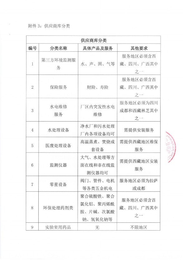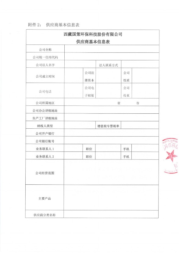 為規(guī)范西藏國(guó)策環(huán)??萍脊煞萦邢薰荆ㄒ韵潞?jiǎn)稱國(guó)策環(huán)保或公司)采購(gòu)行為,加強(qiáng)采購(gòu)管理,維護(hù)公司采購(gòu)當(dāng)事人的合法權(quán)益,更好地與廣大供應(yīng)商合作,依據(jù)公司采購(gòu)管理、供應(yīng)商管理有關(guān)制度的規(guī)定,公司現(xiàn)征集采購(gòu)供應(yīng)商入庫(kù)登記,以建立規(guī)范完整的供應(yīng)商信息庫(kù)。歡迎各企業(yè)(供應(yīng)商)踴躍入庫(kù),現(xiàn)將有關(guān)事宜通知如下:
